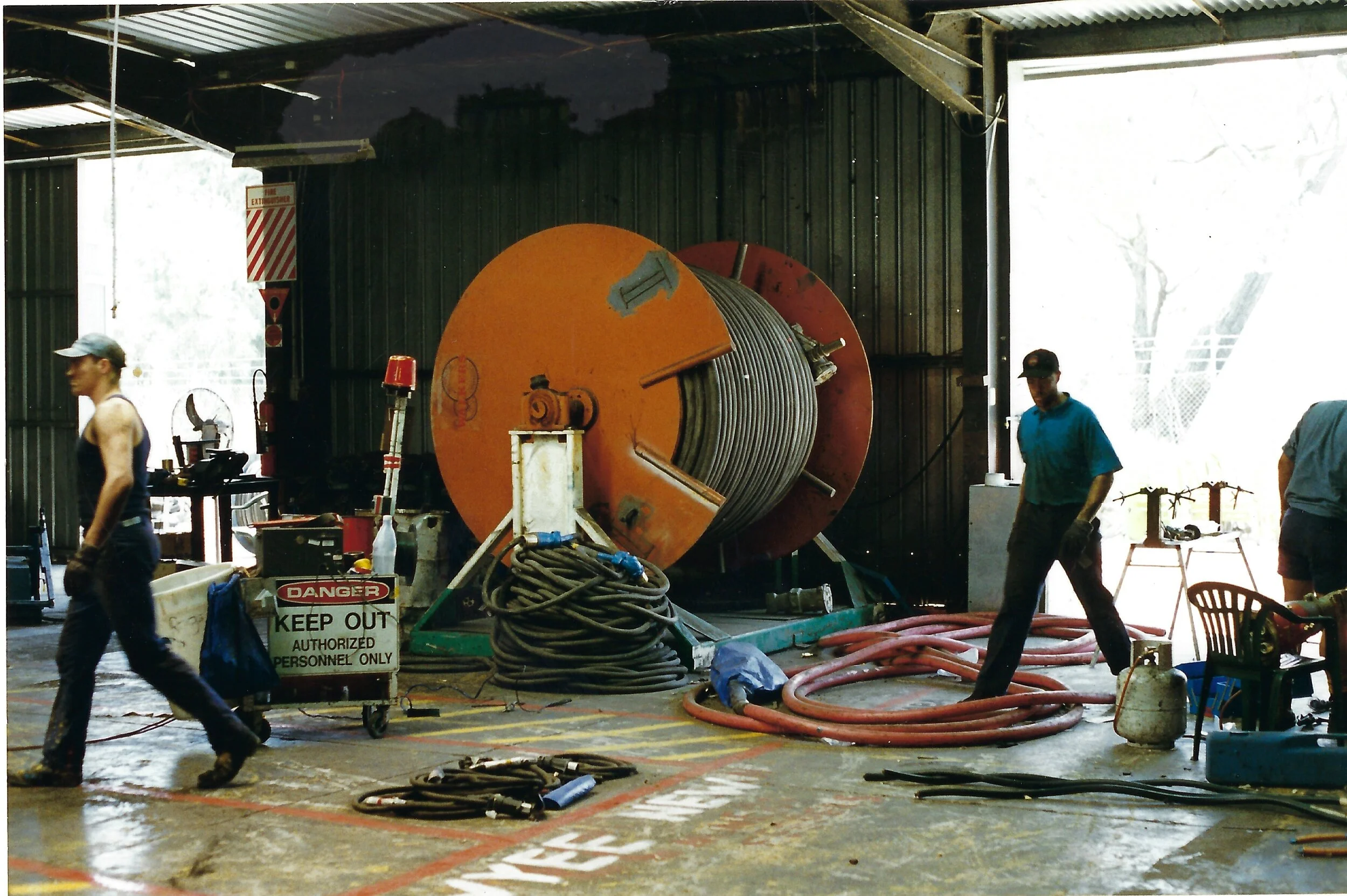 Illawarra Cable Repairs staff with paper lead on the big drum roller. Designed by Greg Sims in 1991